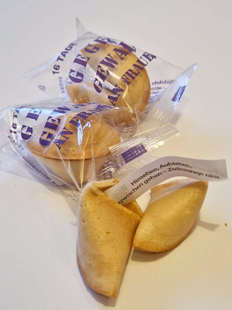 Bereits zum zweiten Mal in Folge wurden 2025 Glückskekse in Innsbruck verteilt, um auf Gewalt gegen Frauen* und Mädchen* aufmerksam zu machen. In den Glückskeksen finden sich Botschaften, die für verschiedene Formen der Gewalt sensibilisieren sowie ein QR Code zu den Anlaufstellen (siehe unten.)